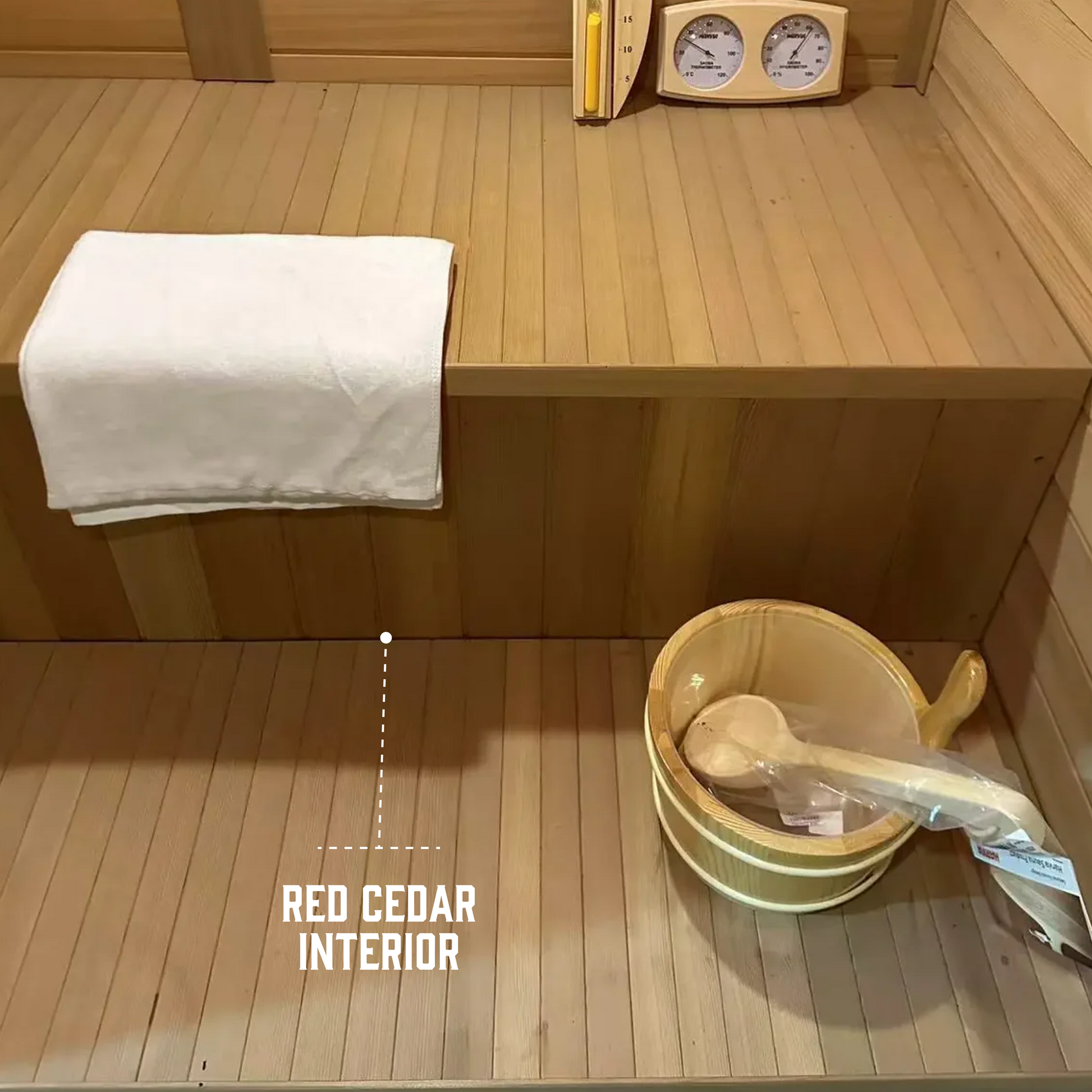 Included Accessories: Wooden bucket & spoon, Volcanic stones (anti-crack, steam-generating), Sandglass timer, Thermo-hygrometer, Explosion-proof light